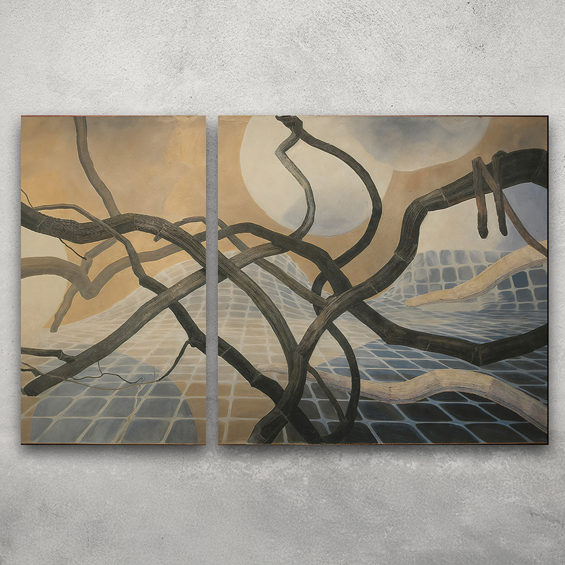 In this landscape, the illusion of completion dissolves: intertwined lines sprout and fade, pointing to subtle yet inevitable transformations. The work invites the viewer into the slow process of forming new hybrid bodies, where the organic and the artificial no longer exist apart, but generate a shared field of unstable equilibria.