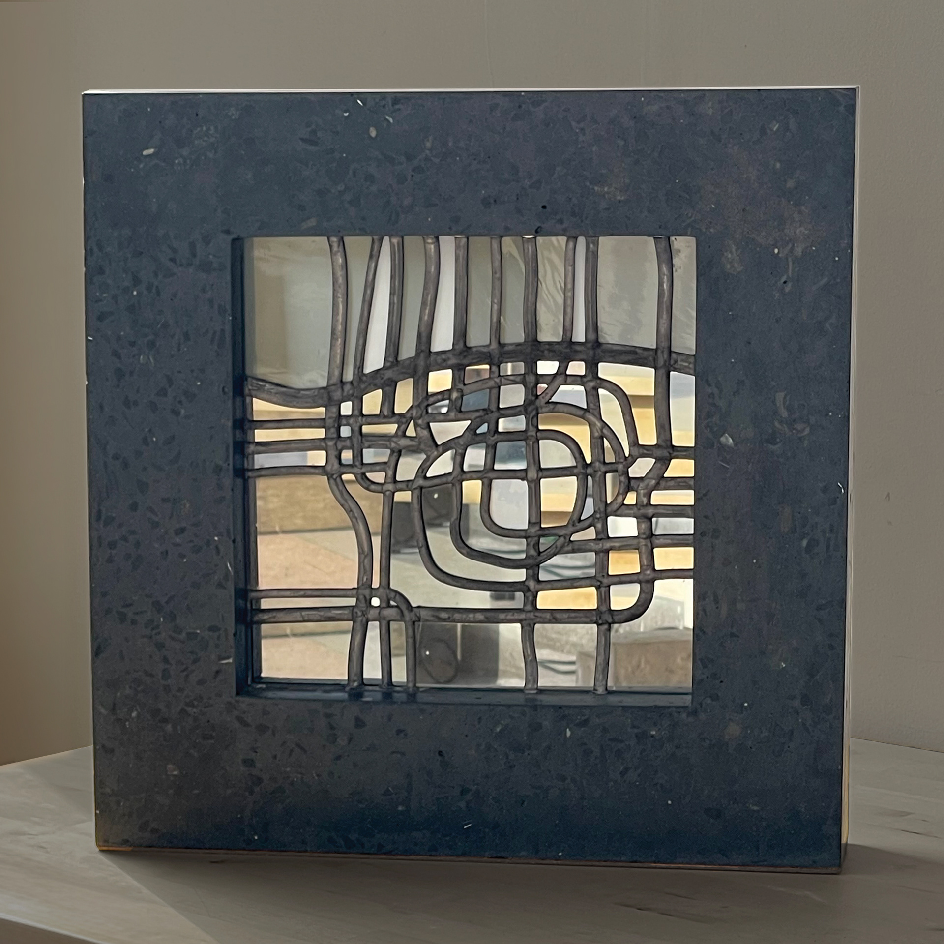 2025, lead, mirrored glass, concrete, 19 × 19 × 3.5 in