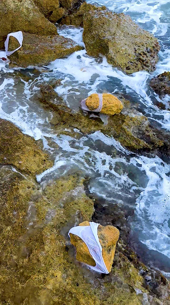 Where Are You transforms underwear into a second skin for stone, carried by water into cycles of dissolution and renewal. Intimacy shifts into resilience as fabric, rock, and tide form an unstable balance. Feminine vulnerability turns into strength, unfolding within a web of unstable ecological relations that echo Timothy Morton’s dark ecology.