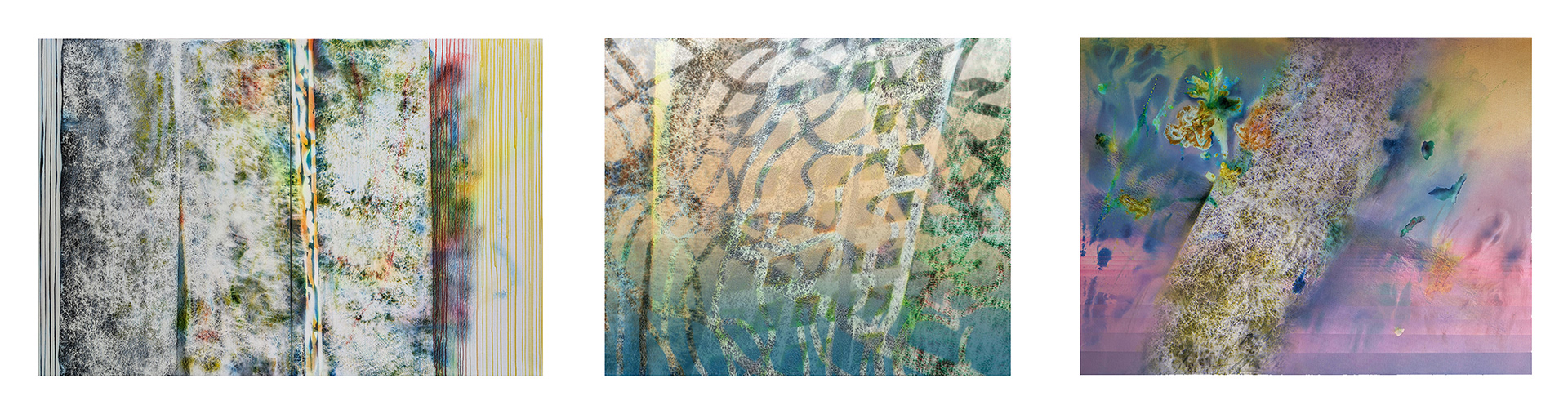 This trio of paintings imagines future ruins where digital residue intertwines with organic matter. Airbrushed strata drift into unstable horizons; fluorescent traces glow like dust of time; fragments suggest an archaeology already unfolding. Together, they map thresholds where memory mutates into matter.